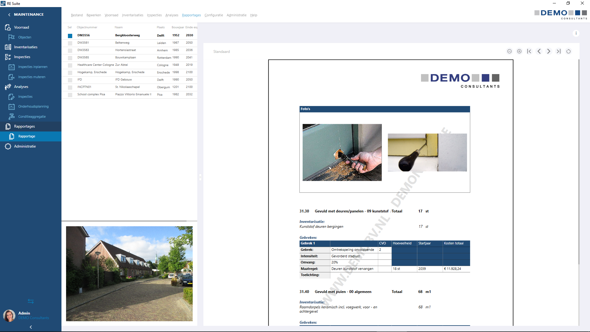 • Extensive analysis capabilities based on the available data such as analysis of maintenance costs per object, selection of objects and total portfolio or analysis of the condition of building parts, specific objects or the total portfolio